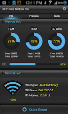 All-In-One Toolbox provides comprehensive system optimizing techniques, including real-time memory info, one click memory quick boosting, task killer, cache cleaner, history cleaner, and SD file manager etc. It embraces all factors that matter to device performance, and helps to optimize your device to run at optimum speed.